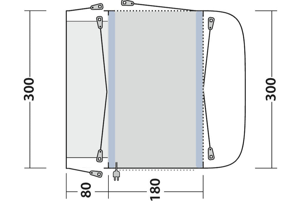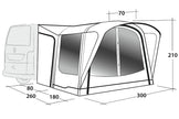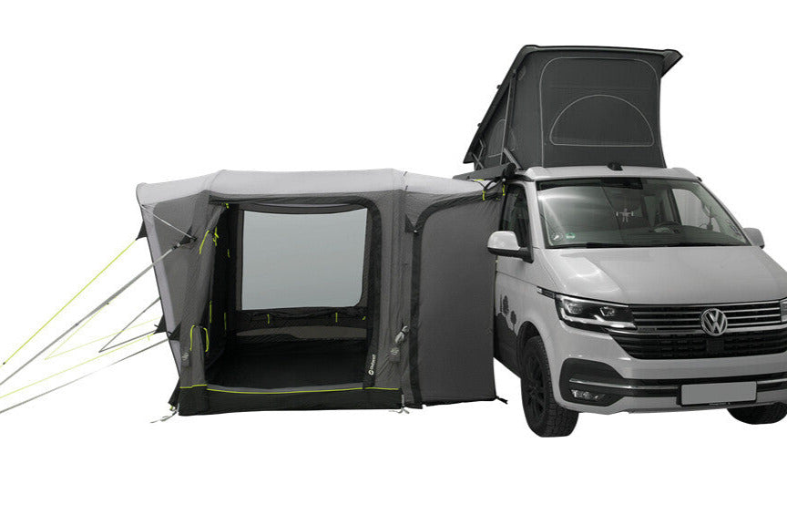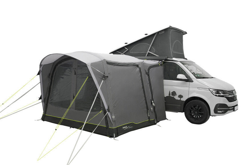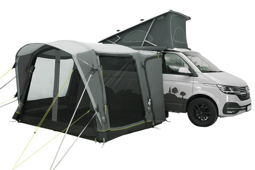 Geniet van beschutting in elk weer met de veelzijdige, opblaasbare Outwell California Highway Air drive-away luifel. Bevestig ze eenvoudig en snel parallel aan je camper, wat de totale breedte op kleine plaatsen vermindert. De brede zij- en voordeuren kunnen opzij worden gerold, zodat je van de natuur kunt genieten vanuit de tent.